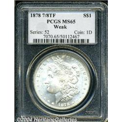 <B>1878 7/8TF<S$1> Weak MS65 PCGS.</B></I> Virtually untoned with bright satiny luster. Softness in the hair over Liberty's ear, but otherwise nicely struck throughout, and minimally abraded. Population: 83 in 65, 10 finer (3/04). <BR><BR><B>Important notice:</B> Heritage usually auctions material at the rate of 200-250 lots per hour. On some occasions eBay Live bid software or the Internet may not be able to keep up with the pace of the auction. We recommend placing a realistic absentee bid now as insurance to avoid disappointment. Occasionally the auctioneer may eliminate or reject an eBay Live bid, and the auctioneer may also reopen a lot after the close of the eBay live bidding (usually because we missed an audience bid), and may reject your bid even if it shows you as the winning bidder. By bidding via eBay Live, you agree that Heritage may award the lot to another bidder at its sole discretion under the circumstances described above or any other reasonable circumstances. Since eBay bids are not shown to us until we open the lot on the floor, we treat those bids just like floor bids. In most cases the floor responds before the eBay bid is presented to us, due to Internet lag time, so for consistency we have made it a policy that floor bids are always considered first over tie eBay live bids. Also please note that all Heritage lots purchased through eBay Live carry a 20% Buyer's Premium. Please make sure you read the Terms and Conditions before you bid.