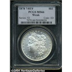 <B>1878 7/8TF<S$1> Weak MS66 PCGS.</B></I> Satiny-white, with no other colors present. The fields and surfaces are well preserved and essentially free of any mentionable bagmarks. One small planchet depression is noted on Liberty's chin. This same depression has been seen on previously cataloged examples of this date and type. Attractive with sharply struck devices, and among the finest known pieces. Population: 10 in 66, 0 finer (3/04). <BR><BR><B>Important notice:</B> Heritage usually auctions material at the rate of 200-250 lots per hour. On some occasions eBay Live bid software or the Internet may not be able to keep up with the pace of the auction. We recommend placing a realistic absentee bid now as insurance to avoid disappointment. Occasionally the auctioneer may eliminate or reject an eBay Live bid, and the auctioneer may also reopen a lot after the close of the eBay live bidding (usually because we missed an audience bid), and may reject your bid even if it shows you as the winning bidder. By bidding via eBay Live, you agree that Heritage may award the lot to another bidder at its sole discretion under the circumstances described above or any other reasonable circumstances. Since eBay bids are not shown to us until we open the lot on the floor, we treat those bids just like floor bids. In most cases the floor responds before the eBay bid is presented to us, due to Internet lag time, so for consistency we have made it a policy that floor bids are always considered first over tie eBay live bids. Also please note that all Heritage lots purchased through eBay Live carry a 20% Buyer's Premium. Please make sure you read the Terms and Conditions before you bid. </span></font></tr></table></td></tr></table>
