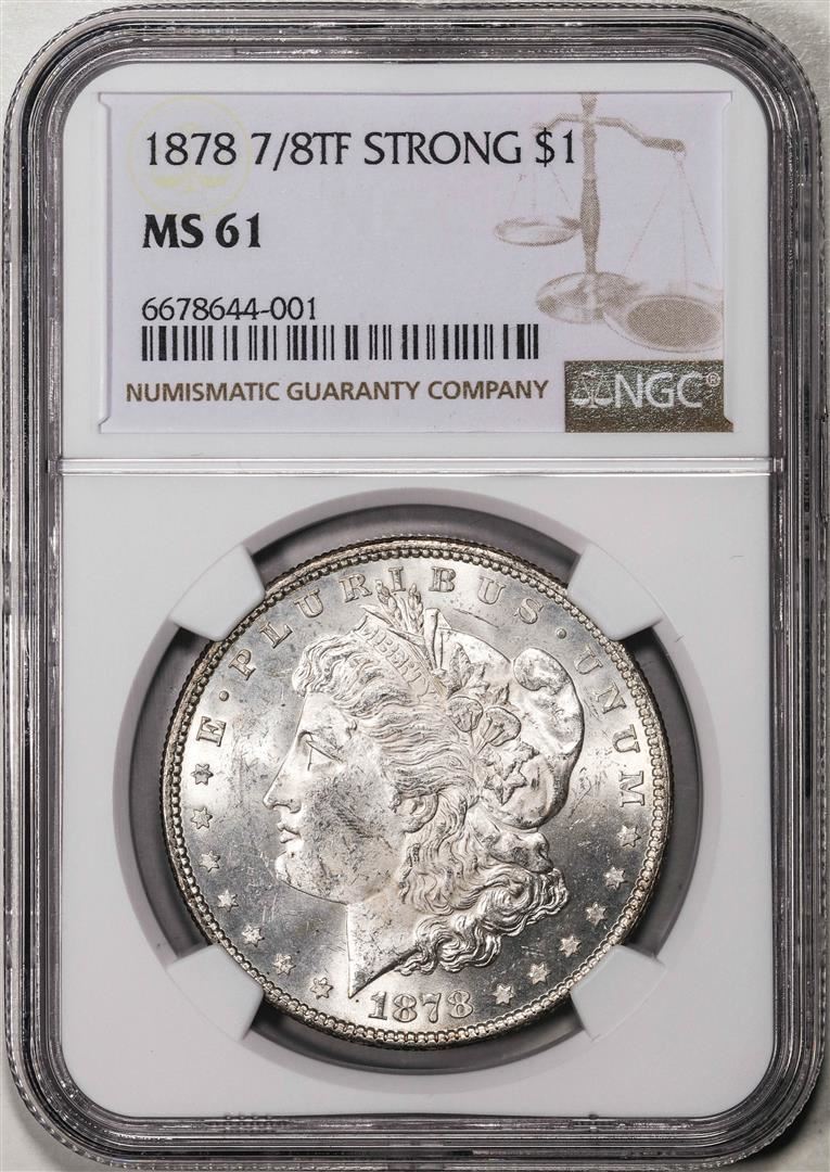 One 1878 7/8TF Strong $1 Morgan Silver Dollar Coin NGC MS61. NGC Certified.