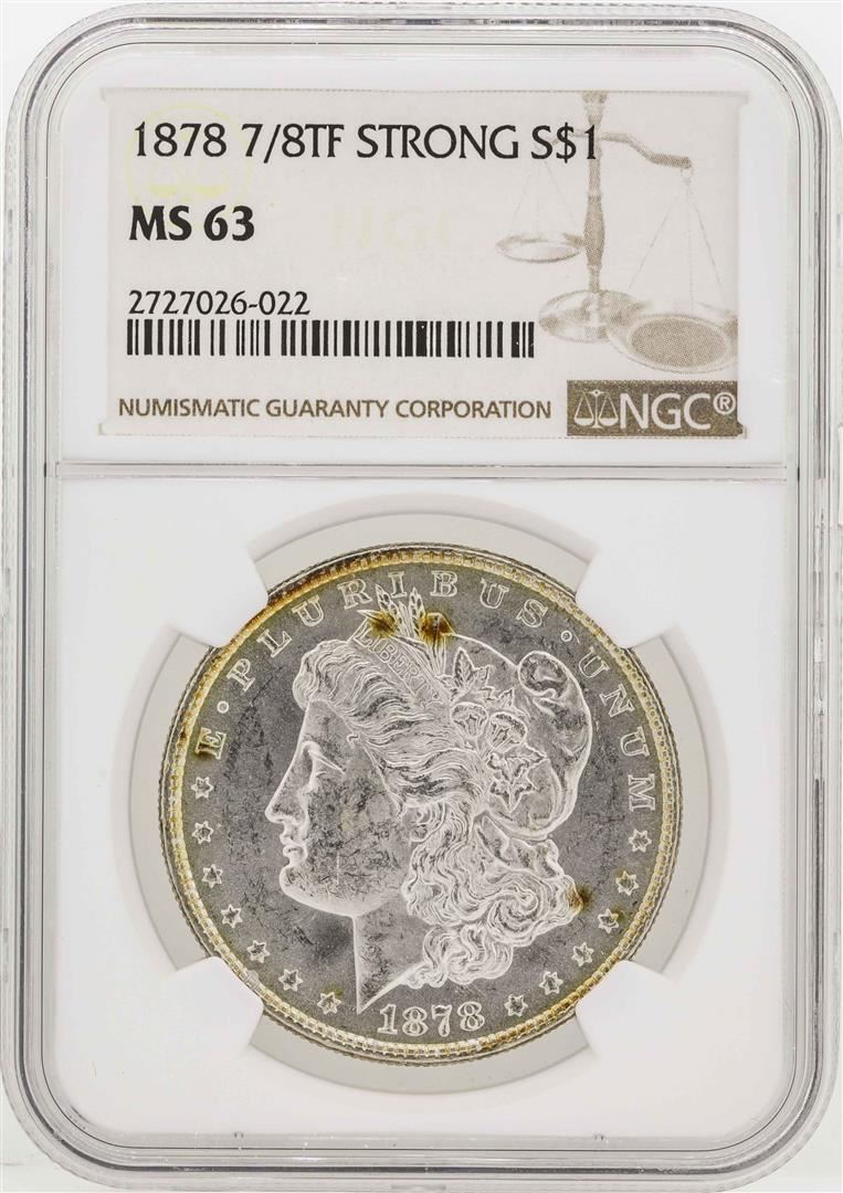 One 1878 7/8TF Strong $1 Morgan Silver Dollar Coin NGC MS63. NGC Certified.