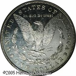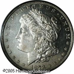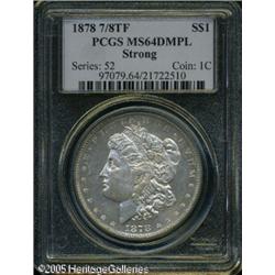 <B>1878 7/8TF<img border='0' src='http://www.heritagecoins.com/images/star.gif' width=10 height=10>$1 Strong MS64 Deep Mirror Prooflike PCGS.</B></I> The prooflike version of the 7/8 Tailfeathers was recognized as a rarity at least from the mid-1970s. An MS64 coin is just about as nice as this issue is likely to be found with only two pieces known (both PCGS coins) in Gem condition. This is a deeply reflective coin that shows generous amounts of mint frost over the devices. Lightly abraded, the striking details are fully brought up on each side. Population: 25 in 64, 2 finer (1/05). Lot:9894