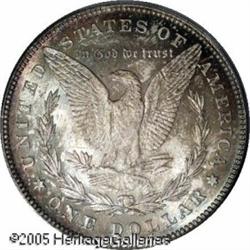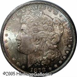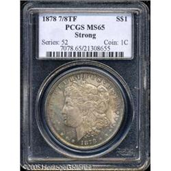 <B>1878 7/8TF<img border='0' src='http://www.heritagecoins.com/images/star.gif' width=10 height=10>$1 Strong MS65 PCGS.</B></I> There are four prominent tail feathers below the major seven tail feathers. A well struck and lustrous piece that has a rich coating of blue-green, gray, and copper-red color on each side. A no-questions Gem example. Lot:9891