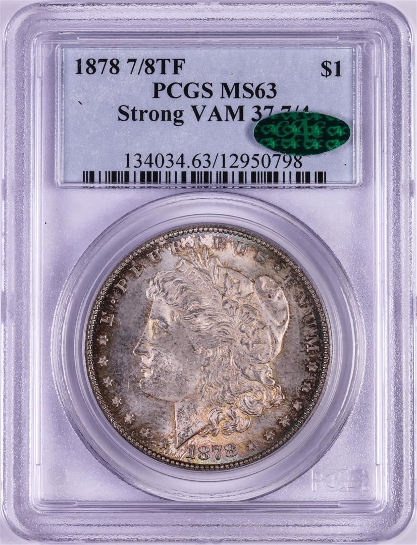 One 1878 7/8TF Strong VAM37 7/4 $1 Morgan Silver Dollar Coin PCGS MS63 CAC. PCGS Graded.
