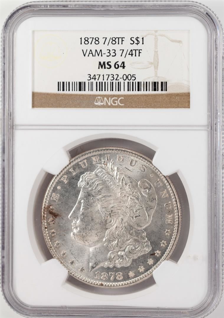 One 1878 7/8TF VAM-33 7/4TF $1 Morgan Silver Dollar Coin NGC MS64. NGC Certified.