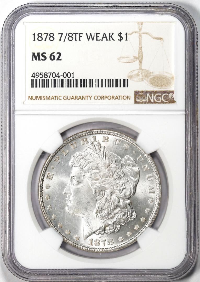 One 1878 7/8TF Weak $1 Morgan Silver Dollar Coin NGC MS62.