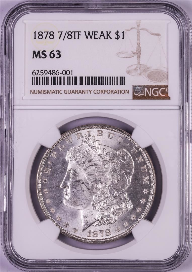 One 1878 7/8TF Weak $1 Morgan Silver Dollar Coin NGC MS63. NGC Certified.