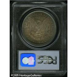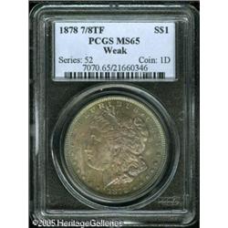 <B>1878 7/8TF<img border='0' src='http://www.heritagecoins.com/images/star.gif' width=10 height=10>$1 Weak MS65 PCGS.</B></I> Beautiful electric-blue iridescence adorns the peripheral areas of each side, while the fields and centers display attractive violet-gray toning. Sharply struck with vibrant underlying luster and few marks. A grease streak (as struck), in the upper left obverse field, does not effect the technical grade. Conditionally scarce as a Gem, and very few are known any finer, at PCGS. Population: 95 in 65, 11 finer (1/05). Lot:9895
