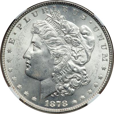 1878. 7 tail feathers. Top 100. Vam-141. NGC graded MS-64. TDO Star. Untoned. Pop 13; 3 in 65, 1 in 66.