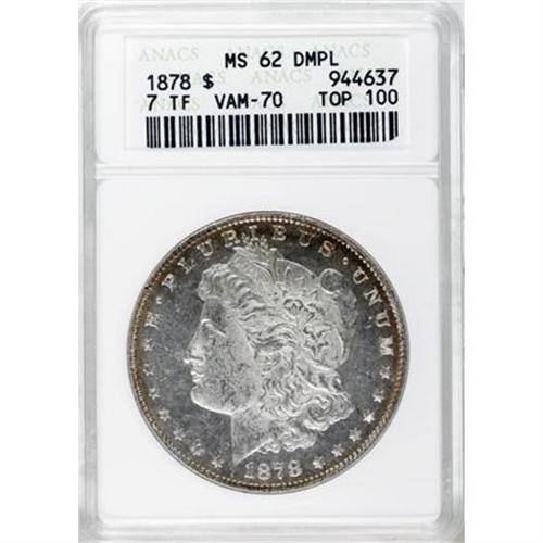 <B>1878 7TF $1 Reverse of 1878 MS62 Deep Mirror Prooflike ANACS. </B></I>VAM-70. A Top 100 Variety.<B> </B></I>(#97075)<BR><BR><b>Shipping:</b> Coins & Currency (<a target="_blank" href="http://www.heritageauctions.com/common/shipping.php">view shipping information</a>)