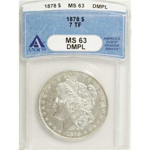 <B>1878 7TF $1 Reverse of 1878 MS63 Deep Mirror Prooflike ANACS.</B></I> NGC Census: (0/0). PCGS Population (126/71). Numismedia Wsl. Price for NGC/PCGS coin in MS63: $320. (#97075)<BR><BR><b>Shipping:</b> Coins & Currency (<a target="_blank" href="http://www.heritageauctions.com/common/shipping.php">view shipping information</a>)
