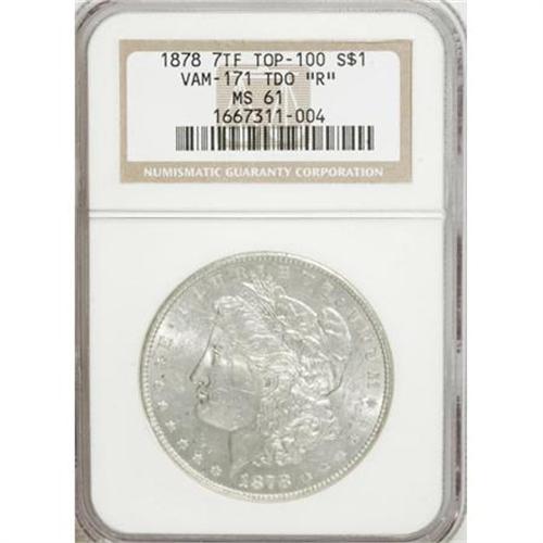 <B>1878 7TF $1 Triple Die Obverse "R" MS61 NGC.</B></I> VAM-171. A Top 100 Variety. Census: (360/7729). PCGS Population (225/6393). Mintage: 4,900,000. Numismedia Wsl. Price for NGC/PCGS coin in MS61: $52. (#7074)<BR><BR><B>Coin Engraver:</B> George T. Morgan<BR><BR><b>Shipping:</b> Coins & Currency (<a target="_blank" href="http://www.heritageauctions.com/common/shipping.php">view shipping information</a>)