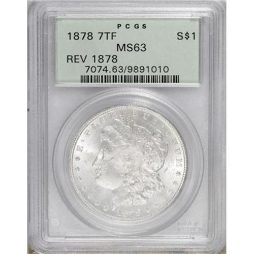 <B>1878 7TF $1 Reverse of 1878 MS63 PCGS.</B></I> PCGS Population (2726/2496). NGC Census: (3091/3515). Mintage: 4,900,000. Numismedia Wsl. Price for NGC/PCGS coin in MS63: $92. (#7074)<BR><BR><B>Coin Engraver:</B> George T. Morgan<BR><BR><b>Shipping:</b> Coins & Currency (<a target="_blank" href="http://www.heritageauctions.com/common/shipping.php">view shipping information</a>)