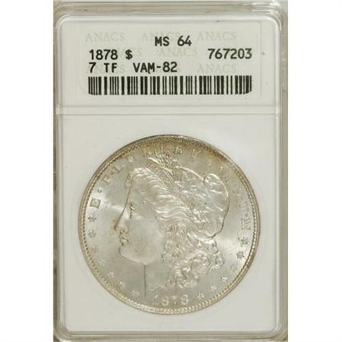 <B>1878 7TF $1 Reverse of 1878 MS64 ANACS.</B></I> VAM-82. NGC Census: (3043/469). PCGS Population (2012/443). Mintage: 4,900,000. Numismedia Wsl. Price for NGC/PCGS coin in MS64: $228. (#7074)<BR><BR><B>Coin Engraver:</B> George T. Morgan<BR><BR><b>Shipping:</b> Coins & Currency (<a target="_blank" href="http://www.heritageauctions.com/common/shipping.php">view shipping information</a>)