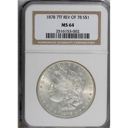 <B>1878 7TF $1 Reverse of 1878 MS64 NGC.</B></I> NGC Census: (3043/469). PCGS Population (2041/448). Mintage: 4,900,000. Numismedia Wsl. Price for NGC/PCGS coin in MS64: $228. (#7074)<BR><BR><B>Coin Engraver:</B> George T. Morgan<BR><BR><b>Shipping:</b> Coins & Currency (<a target="_blank" href="http://www.heritageauctions.com/common/shipping.php">view shipping information</a>)