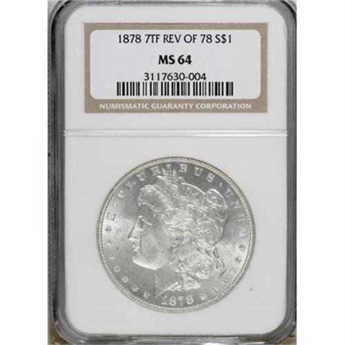 <B>1878 7TF $1 Reverse of 1878 MS64 NGC.</B></I> . NGC Census: (3063/470). PCGS Population (2070/452). Mintage: 4,900,000. Numismedia Wsl. Price for NGC/PCGS coin in MS64: $220. (#7074)<BR><BR><B>Coin Engraver:</B> George T. Morgan<BR><BR><b>Shipping:</b> Coins & Currency (<a target="_blank" href="http://www.heritageauctions.com/common/shipping.php">view shipping information</a>)