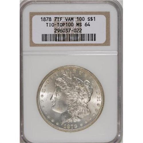 <B>1878 7TF $1 Reverse of 1878, Type 1 obverse MS64 NGC.</B></I> VAM-100. A top 100 variety. NGC Census: (3061/469). PCGS Population (2103/458). Mintage: 4,900,000. Numismedia Wsl. Price for NGC/PCGS coin in MS64: $220. (#7074)<BR><BR><B>Coin Engraver:</B> George T. Morgan<BR><BR><b>Shipping:</b> Coins & Currency (<a target="_blank" href="http://www.heritageauctions.com/common/shipping.php">view shipping information</a>)