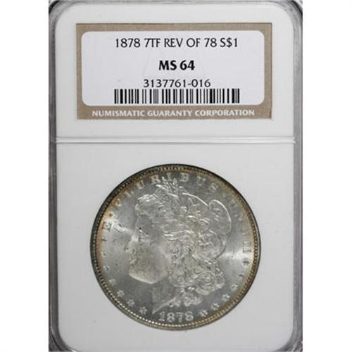 <B>1878 7TF $1 Reverse of 1878 MS64 NGC.</B></I> NGC Census: (3061/469). PCGS Population (2094/456). Mintage: 4,900,000. Numismedia Wsl. Price for NGC/PCGS coin in MS64: $220. (#7074)<BR><BR><B>Coin Engraver:</B> George T. Morgan<BR><BR><b>Shipping:</b> Coins & Currency (<a target="_blank" href="http://www.heritageauctions.com/common/shipping.php">view shipping information</a>)