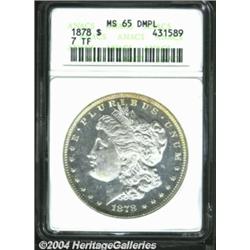 <table><tbody><tr><td><table> <TR><TD width="100%"><TABLE cellSpacing=1 cellPadding=3 width="100%" border=0><TBODY><TR><TD width="100%" bgColor=#79735c><FONT face=arial color=#ffffff size=3><B>Description</B> </FONT></TD></TR><TR><TD width="100%" bgColor=#ffffff><FONT face=arial size=2><B>1878 7TF $1 Reverse of 1878 MS65 Deep Mirror Prooflike ANACS.</B></I> Sparkling reflective qualities of equal intensity are displayed on obverse and reverse, with more contrast than is usually found on this first year issue, and a scarcity of contact marks. </FONT></TD></TR></TBODY></TABLE></TD></TR></TBODY></TABLE><BR><A name=PricesRealized></A><TABLE cellSpacing=0 cellPadding=0 width="100%" bgColor=#000000 border=0><TBODY><TR><TD width="100%"><TABLE cellSpacing=1 cellPadding=3 width="100%" border=0><TBODY><TR><TD width="100%" bgColor=#79735c><A name=PR><FONT face=arial color=#ffffff size=3><B>Previous Prices from Heritage Auctions</B> </FONT></A></TD></TR><TR><TD bgColor=#f6f6ed><TABLE cellSpacing=0 cellPadding=0 width="100%" border=1><TBODY><TR><TD align=middle width="33%"><B>Date</B></TD><TD align=middle width="33%"><B>Service</B></TD><TD align=middle width="33%"><B>Price</B></TD></TR><TR bgColor=whitesmoke><TD width="33%"><B>03/23/2003</B></TD><TD width="33%">ANACS</TD><TD width="33%">$2,760.00</TD></TR><TR bgColor=whitesmoke><TD width="33%"><B>05/05/2000</B></TD><TD width="33%">ANACS</TD><TD width="33%">$2,070.00</TD></TR><TR bgColor=whitesmoke><TD width="33%"><B>08/02/1997</B></TD><TD width="33%">ANACS</TD><TD width="33%">$1,092.50</TD></TR></TBODY></TABLE></TD></TR><TR><TD bgColor=#ffffff><FONT face=arial size=1 ?>PLEASE NOTE: All prices realized reflect the final hammer price PLUS the buyer's premium in auctions that charge a buyer's premium. Each item has a notation at the top of the listing indicating whether that lot included a buyer's premium. Example: A item that sells with a final hammer price of $100 and a 20% buyer's premium will display with a price realized of $120. All information listed is intended to be as accurate as possible, but errors are possible. Please use this guide carefully and inform us of any inaccuracies. </FONT></TD></TR></TBODY></TABLE></TD></TR></TBODY></TABLE><BR><TABLE cellSpacing=0 cellPadding=0 width="100%" bgColor=#000000 border=0><TBODY><TR><TD width="100%"><TABLE cellSpacing=1 cellPadding=3 width="100%" border=0><TBODY><TR><TD width="100%" bgColor=#79735c colSpan=6><FONT face=arial color=#ffffff size=3><B>Price Guide*</B> </FONT></TD></TR><TR bgColor=#f6f6ed><TD align=middle><B>Grade</B> </TD><TD align=middle><B>Coin World<BR>(Trends)</B> </TD><TD align=middle><B>Numismedia<BR>Retail</B> </TD><TD align=middle><B>Numismedia<BR>Wholesale</B> </TD><TD align=middle><B>Coin<BR>Universe</B> </TD><TD align=middle><B>Heritage<BR>Value Index</B> </TD></TR><TR bgColor=#ffffff><TD align=middle>64</TD><TD align=right>$550.00</TD><TD align=right>$640.00</TD><TD align=right>$515.00</TD><TD align=right>$455.00</TD><TD align=right>$403.38</TD></TR><TR style="FONT-WEIGHT: bold" bgColor=#cccfdd><TD align=middle>65</TD><TD align=right>$6,000.00</TD><TD align=right>---</TD><TD align=right>$4,650.00</TD><TD align=right>$6,300.00</TD><TD align=right>$4,370.00</TD></TR><TR bgColor=#ffffff><TD align=middle>66</TD><TD align=right>---</TD><TD align=right>---</TD><TD align=right>---</TD><TD align=right>---</TD><TD align=right>---</TD></TR><TR bgColor=#ffffff><TD colSpan=6><FONT size=1>*All information listed is intended to be as accurate as possible, but errors are possible. No item may be returned or refused based on this information which is provided as a service to our customers. You should contact each pricing source directly to determine the accuracy of this information. </FONT></TD></TR></TBODY></TABLE></TD></TR></TBODY></TABLE><BR><TABLE cellSpacing=0 cellPadding=0 width="100%" bgColor=#000000 border=0><TBODY><TR><TD width="100%"><TABLE cellSpacing=1 cellPadding=3 width="100%" border=0><TBODY><TR><TD width="100%" bgColor=#79735c><FONT face=arial color=#ffffff size=3><B>Population Guide</B> </FONT></TD></TR><TR bgColor=#ffffff><TD align=middle><!-- Begin Output of Population Grid--><TABLE cellSpacing=0 cellPadding=0 width="100%" border=0><TBODY><TR><TD vAlign=center><TABLE cellSpacing=0 width="100%" border=1 cellsadding="3"><TBODY><TR><TD vAlign=center><TABLE cellSpacing=0 cellPadding=3 width="100%" border=1><TBODY><TR><TD vAlign=center align=middle bgColor=#f0f1e8 colSpan=2 <CENTER><FONT face=Arial size=2><B>PCGS Pop </B></FONT><CENTER></CENTER></TD><TD vAlign=center align=middle bgColor=#f0f1e8 colSpan=2><CENTER><FONT face=Arial size=2><B>NGC Pop</B></CENTER></FONT></TD></TR><TR><TD vAlign=center><FONT face=Arial size=2>(65)</FONT> </TD><TD vAlign=center align=right><FONT face=Arial size=2>6</FONT> </TD><TD vAlign=center><FONT face=Arial size=2>(65)</FONT> </TD><TD vAlign=center align=right><FONT face=Arial size=2>0</FONT> </TD></TR><TR><TD vAlign=center><FONT face=Arial size=2>(>65)</FONT> </TD><TD vAlign=center align=right><FONT face=Arial size=2>0</FONT> </TD><TD vAlign=center><FONT face=Arial size=2>(>65)</FONT> </TD><TD vAlign=center align=right><FONT face=Arial size=2>0</FONT> </TD></TR></TBODY></TABLE></TD></TR></TBODY></TABLE></TD></TR></TBODY></TABLE><!-- End Output of Population Grid--></TD></TR></TBODY></TABLE></TD></TR></TBODY></TABLE><BR><TABLE cellSpacing=0 cellPadding=0 width="100%" bgColor=#000000 border=0><TBODY><TR> <font color='#000000'><span style='background-color: #FFFFFF'><td bgcolor='#FFFFFE'> Important notice: Heritage usually auctions material at the rate of 200-250 lots per hour. On some occasions eBay Live bid software or the Internet may not be able to keep up with the pace of the auction. We recommend placing a realistic absentee bid now as insurance to avoid disappointment. Occasionally the auctioneer may eliminate or reject an eBay Live bid, and the auctioneer may also reopen a lot after the close of the eBay live bidding (usually because we miss