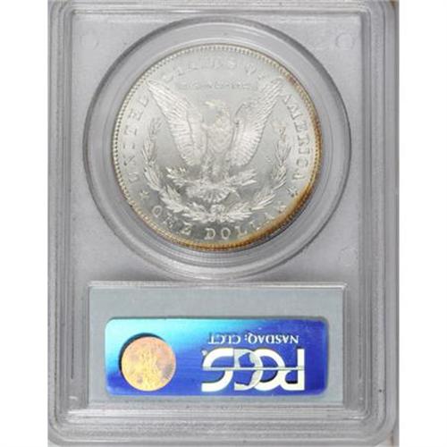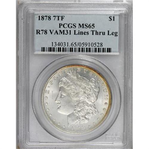 <B>1878 7TF $1 Reverse of 1878 MS65 PCGS.</B></I> VAM-31. The "Lines Through Leg" variety, more descriptively termed "Doubled Legs" by Van Allen and Mallis, shows a secondary set of eagle's legs shifted to the right of the main devices. This well struck and strongly lustrous Gem offers untoned centers with a touch of gold-orange patina at the right obverse and reverse margins.<BR><BR><b>Shipping:</b> Coins & Currency (<a target="_blank" href="http://www.heritageauctions.com/common/shipping.php">view shipping information</a>)