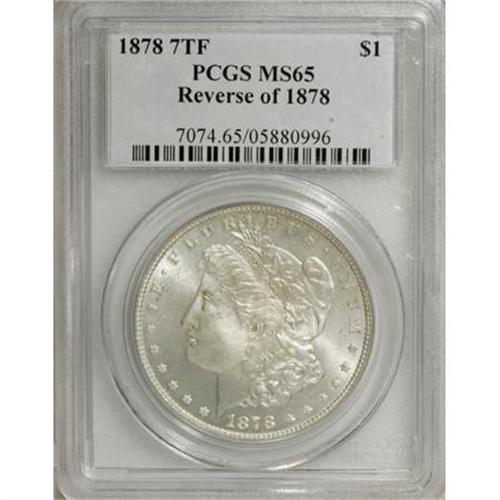<B>1878 7TF $1 Reverse of 1878 MS65 PCGS.</B></I> Boldly impressed with excellent eye appeal even by Gem standards. Soft golden tinges visit the obverse, while the reverse is essentially brilliant. PCGS has graded 18 finer pieces (1/08).<BR><BR><B>Coin Engraver:</B> George T. Morgan<BR><BR><b>Shipping:</b> Coins & Currency (<a target="_blank" href="http://www.heritageauctions.com/common/shipping.php">view shipping information</a>)