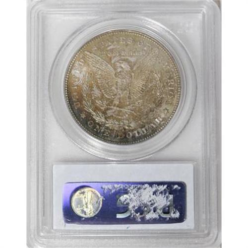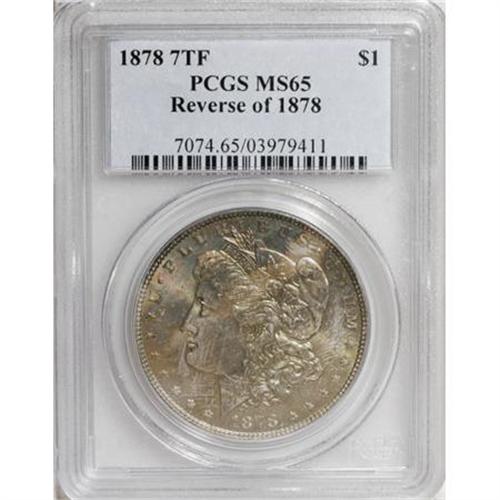 <B>1878 7TF $1 Reverse of 1878 MS65 PCGS.</B></I> Wonderful waves of saffron, jade, and lilac cascade diagonally across this radiant and untroubled Gem, which has the parallel arrow feathers and flat eagle's breast of the Reverse of 1878. PCGS has certified only 18 pieces finer of the variety. For a new collecting challenge, try putting together a Morgan dollar set of all of the 1878 mintmarks and subtypes, or of all the major VAM varieties!<BR><BR><B>Coin Engraver:</B> George T. Morgan<BR><BR><b>Shipping:</b> Coins & Currency (<a target="_blank" href="http://www.heritageauctions.com/common/shipping.php">view shipping information</a>)