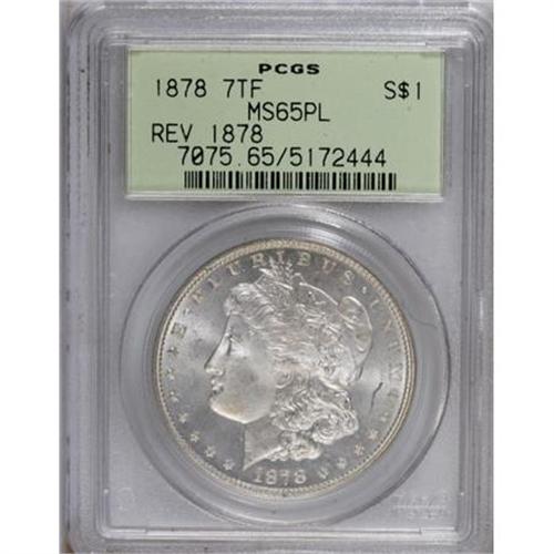 <B>1878 7TF $1 Reverse of 1878 MS65 Prooflike PCGS.</B></I> The 7 Tail Feather Reverse style was used in about a 10:1 ratio over the short-lived 8 Tail Feather Reverse, but Gem 7 Tail Feather Reverse specimens are nonetheless elusive. Brilliant silver-white and fully prooflike on both sides, certified in an old-style PCGS green-label holder. A nice coin for the grade.<BR><BR><B>Coin Engraver:</B> George T. Morgan<BR><BR><b>Shipping:</b> Coins & Currency (<a target="_blank" href="http://www.heritageauctions.com/common/shipping.php">view shipping information</a>)