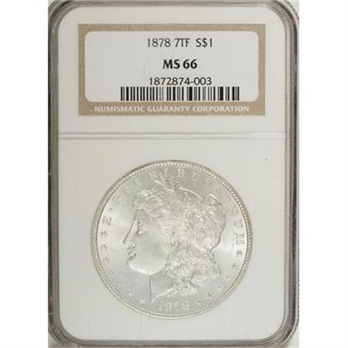 <B>1878 7TF $1 Reverse of 1878 MS66 NGC.</B></I> The 1878 Reverse of 1878 dollar displays parallel arrow feathers, and flatness, or concaveness, on the eagle's breast. This color-free Premium Gem possesses great luster and design element delineation. Some inoffensive luster grazes are within the parameters of the grade designation. Census: 22 in 66, 0 finer (6/07).<BR><I>From the Reuben Reinstein Collection.</B></I><BR><BR><b>Shipping:</b> Coins & Currency (<a target="_blank" href="http://www.heritageauctions.com/common/shipping.php">view shipping information</a>)