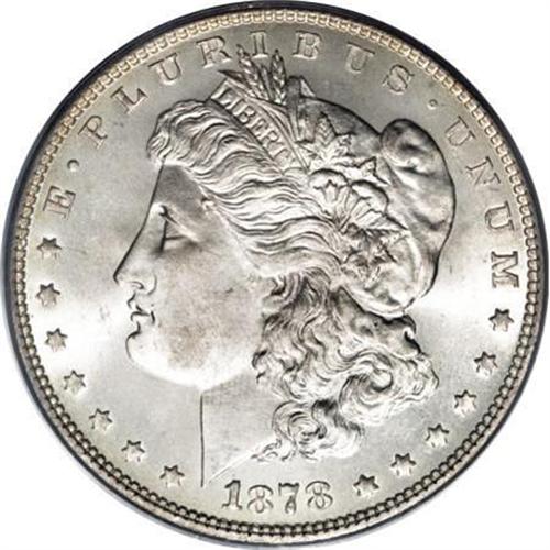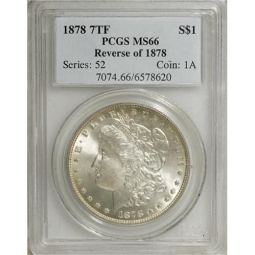 <B>1878 7TF $1 Reverse of 1878 MS66 PCGS.</B></I> This is a splendid Premium Gem, with mild satin luster, iridescent lemon-yellow rim toning, and semi-reflective reverse fields. The smooth surfaces are primarily beige in color, and the obverse seems essentially mark-free, with a few minor luster grazes. There are a several small coin-to-coin marks on the reverse, which do not overly distract the eye. The strike is quite sharp, with good definition over Liberty's ear, and on the eagle's breast feathers. The reverse legends have a series of wispy die cracks, as struck. Population: 18 in 66, 0 finer (12/07).<BR><I>Ex: Morris Silverman Collection (Heritage, 7/2003), lot 8374.</B></I><BR><I>From The Jimmy G. PCGS Registry Collection of Morgan Dollars with Varieties.</B></I><BR><BR><B>Coin Engraver:</B> George T. Morgan<BR><BR><b>Shipping:</b> Coins & Currency (<a target="_blank" href="http://www.heritageauctions.com/common/shipping.php">view shipping information</a>)