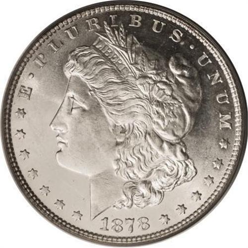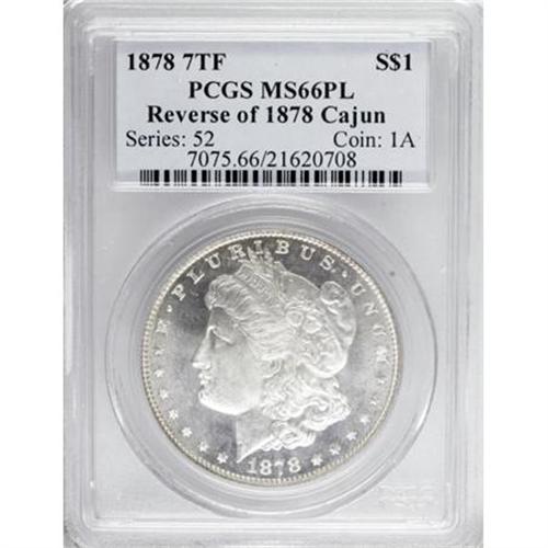 <B>1878 7TF $1 Reverse of 1878 MS66 Prooflike PCGS.</B></I> Ex: Cajun Collection. VAM-82. LIBERTY, the date, and some of the obverse stars are doubled on this VAM variety. A flashy and remarkably smooth Premium Gem with noticeable frost on the portrait. Well struck save for the right claw and the base of the wreath. Essentially brilliant, although a trace of gold toning is present over the denticles. Since PCGS has not encapsulated any Second Reverse dollar as MS67 Prooflike or MS66 DMPL, the present piece is thus tied with one other (as of 6/07) for the honor of finest certified at PCGS. <BR><BR><B>Coin Engraver:</B> George T. Morgan<BR><BR><b>Shipping:</b> Coins & Currency (<a target="_blank" href="http://www.heritageauctions.com/common/shipping.php">view shipping information</a>)