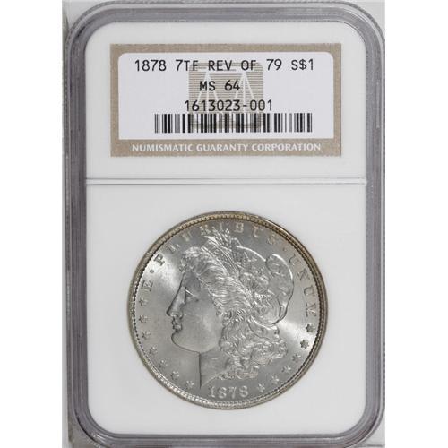 <B>1878 7TF<$1> Reverse of 1879 MS64 NGC.</B></I> Choice and lustrous with excellent definition on the devices. While the prime focal areas are clean, a clump of abrasions on Liberty's neck limits the grade.