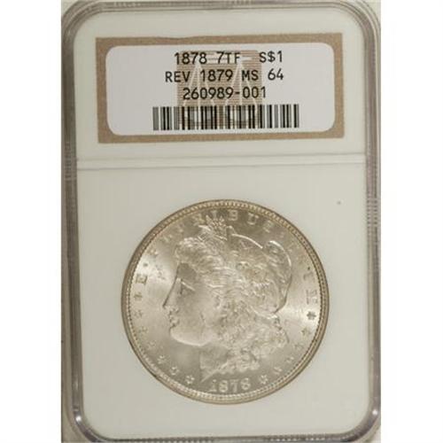 <B>1878 7TF $1 Reverse of 1879 MS64 NGC.</B></I> NGC Census: (937/133). PCGS Population (1040/262). Mintage: 4,300,000. Numismedia Wsl. Price for NGC/PCGS coin in MS64: $500. (#7076)<BR><BR><b>Shipping:</b> Coins & Currency (<a target="_blank" href="http://www.heritageauctions.com/common/shipping.php">view shipping information</a>)