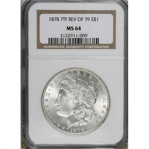 <B>1878 7TF $1 Reverse of 1879 MS64 NGC.</B></I> . NGC Census: (967/135). PCGS Population (1055/286). Mintage: 4,300,000. Numismedia Wsl. Price for NGC/PCGS coin in MS64: $500. (#7076)<BR><BR><B>Coin Engraver:</B> George T. Morgan<BR><BR><b>Shipping:</b> Coins & Currency (<a target="_blank" href="http://www.heritageauctions.com/common/shipping.php">view shipping information</a>)