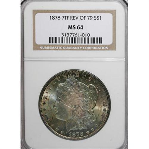 <B>1878 7TF $1 Reverse of 1879 MS64 NGC.</B></I> NGC Census: (964/135). PCGS Population (1063/289). Mintage: 4,300,000. Numismedia Wsl. Price for NGC/PCGS coin in MS64: $500. (#7076)<BR><BR><B>Coin Engraver:</B> George T. Morgan<BR><BR><b>Shipping:</b> Coins & Currency (<a target="_blank" href="http://www.heritageauctions.com/common/shipping.php">view shipping information</a>)