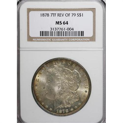 <B>1878 7TF $1 Reverse of 1879 MS64 NGC.</B></I> NGC Census: (964/135). PCGS Population (1063/289). Mintage: 4,300,000. Numismedia Wsl. Price for NGC/PCGS coin in MS64: $500. (#7076)<BR><BR><B>Coin Engraver:</B> George T. Morgan<BR><BR><b>Shipping:</b> Coins & Currency (<a target="_blank" href="http://www.heritageauctions.com/common/shipping.php">view shipping information</a>)