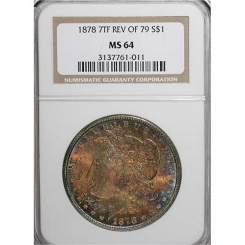 <B>1878 7TF $1 Reverse of 1879 MS64 NGC.</B></I> NGC Census: (964/135). PCGS Population (1063/289). Mintage: 4,300,000. Numismedia Wsl. Price for NGC/PCGS coin in MS64: $500. (#7076)<BR><BR><B>Coin Engraver:</B> George T. Morgan<BR><BR><b>Shipping:</b> Coins & Currency (<a target="_blank" href="http://www.heritageauctions.com/common/shipping.php">view shipping information</a>)