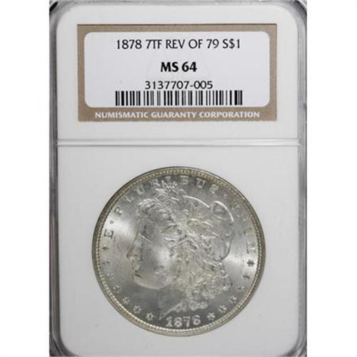 <B>1878 7TF $1 Reverse of 1879 MS64 NGC.</B></I> NGC Census: (964/135). PCGS Population (1063/289). Mintage: 4,300,000. Numismedia Wsl. Price for NGC/PCGS coin in MS64: $500. (#7076)<BR><BR><B>Coin Engraver:</B> George T. Morgan<BR><BR><b>Shipping:</b> Coins & Currency (<a target="_blank" href="http://www.heritageauctions.com/common/shipping.php">view shipping information</a>)