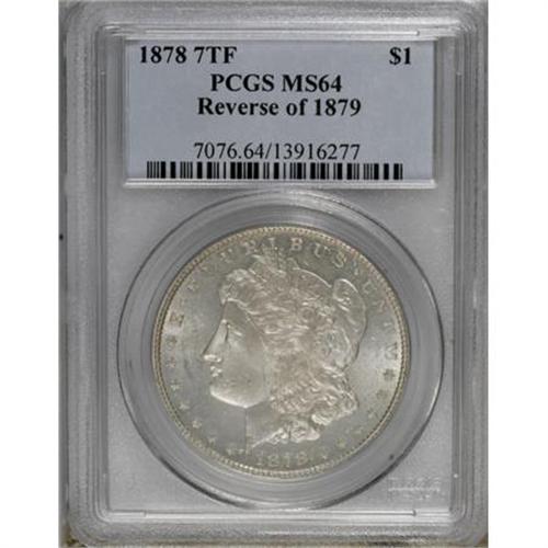 <B>1878 7TF $1 Reverse of 1879 MS64 PCGS.</B></I> . PCGS Population (1055/286). NGC Census: (967/135). Mintage: 4,300,000. Numismedia Wsl. Price for NGC/PCGS coin in MS64: $500. (#7076)<BR><BR><B>Coin Engraver:</B> George T. Morgan<BR><BR><b>Shipping:</b> Coins & Currency (<a target="_blank" href="http://www.heritageauctions.com/common/shipping.php">view shipping information</a>)