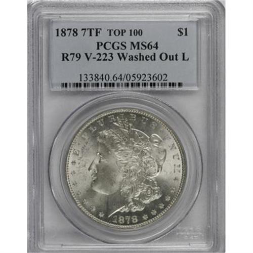 <B>1878 7TF $1 Reverse of 1879 MS64 PCGS.</B></I> VAM-223. A Top 100 Variety. The so-called "Washed-Out L," named for the over-polished L in LIBERTY. This is a boldly impressed and strongly lustrous Choice example, uncommonly high-end for the variant. In its specialized category, this is the only MS64 piece certified by PCGS, with none finer (3/08).<BR><BR><b>Shipping:</b> Coins & Currency (<a target="_blank" href="http://www.heritageauctions.com/common/shipping.php">view shipping information</a>)