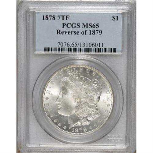 <B>1878 7TF $1 Reverse of 1879 MS65 PCGS.</B></I> The Reverse of 1879, or Third Reverse, is distinguished by the slanted upper feather of the fletchings. This Gem displays just a hint of lemon-gold patina in the fields, and the otherwise untoned surfaces display strong luster. The devices are crisply struck with just a touch of frost on the highpoints. Highly elusive any finer, with just six such coins graded by PCGS (5/07).<BR><BR><b>Shipping:</b> Coins & Currency (<a target="_blank" href="http://www.heritageauctions.com/common/shipping.php">view shipping information</a>)