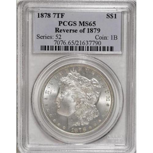 <B>1878 7TF $1 Reverse of 1879 MS65 PCGS.</B></I> A splendid example of the 1879 reverse type with the round-breasted eagle, unlike the usual flat-breasted eagle of 1878. This Gem is fully brilliant with frosty silver luster.<BR><I>From The Motor City Collection.</B></I><BR><BR><B>Coin Engraver:</B> George T. Morgan<BR><BR><b>Shipping:</b> Coins & Currency (<a target="_blank" href="http://www.heritageauctions.com/common/shipping.php">view shipping information</a>)