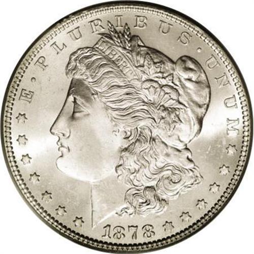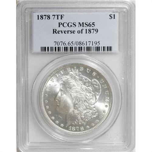 <B>1878 7TF $1 Reverse of 1879 MS65 PCGS.</B></I> A solid strike imparts strong definition on the design elements of this attractive Gem, including strong detail in the hair over Liberty's ear. Highly lustrous, untoned surfaces reveal just a few minor grade-consistent marks. The Reverse of 1879 displays a slanted top arrow feather, and is difficult to acquire any finer.<BR><I>From The Silver Spur Collection of Morgan Dollars.</B></I><BR><BR><B>Coin Engraver:</B> George T. Morgan<BR><BR><b>Shipping:</b> Coins & Currency (<a target="_blank" href="http://www.heritageauctions.com/common/shipping.php">view shipping information</a>)