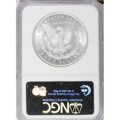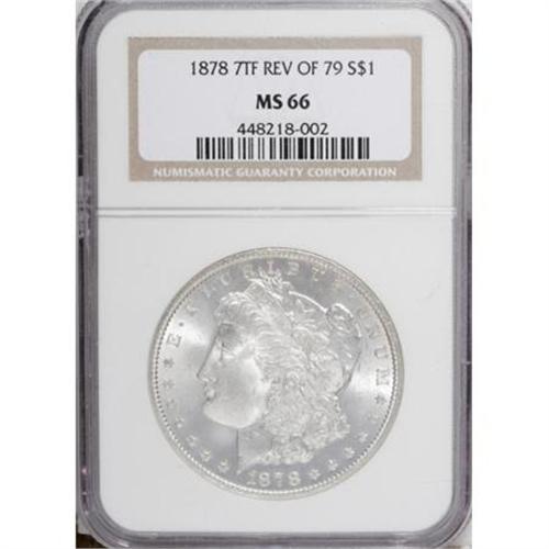 <B>1878 7TF $1 Reverse of 1879 MS66 NGC.</B></I> The 1878 7 Tail Feathers dollar with the Reverse of 1879 is distinguished by a convex breast on the eagle (versus the flat, or concave breast on the Reverse of 1878), and by the slanting top arrow feather. In the Second Edition (2005) of his <I>A Guide Book of Morgan Dollars: A Complete History and Price Guide</B></I>, David Bowers estimates the circulation strike mintage of the Reverse of 1879 variety to be 1,500,000 pieces, compared to an estimate of 7,850,000 coins for the Reverse of 1878 variety, which logically helps to account for the greater scarcity of the former issue.<BR> Potent luster enlivens both obverse and reverse of this Premium Gem specimen, and a well executed strike has left its mark in the form of sharply defined motifs, including the hair above Liberty's ear and the eagle's breast feathers. A few minor, unobtrusive marks prevent this lovely piece from attaining MS67. Census: 12 in 66, 0 finer (6/07).<BR><I>From the Reuben Reinstein Collection.</B></I><BR><BR><b>Shipping:</b> Coins & Currency (<a target="_blank" href="http://www.heritageauctions.com/common/shipping.php">view shipping information</a>)