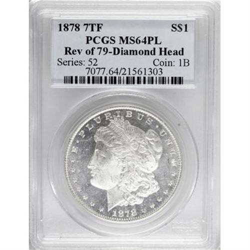 <B>1878 7TF $1 Reverse of 1879 MS64 Prooflike PCGS.</B></I> Ex: Diamond Head. PCGS Population (38/5). NGC Census: (23/1). Numismedia Wsl. Price for NGC/PCGS coin in MS64: $975. (#7077)<BR><I>From The Diamond Head Collection.</B></I><BR><BR><B>Coin Engraver:</B> George T. Morgan<BR><BR><b>Shipping:</b> Coins & Currency (<a target="_blank" href="http://www.heritageauctions.com/common/shipping.php">view shipping information</a>)