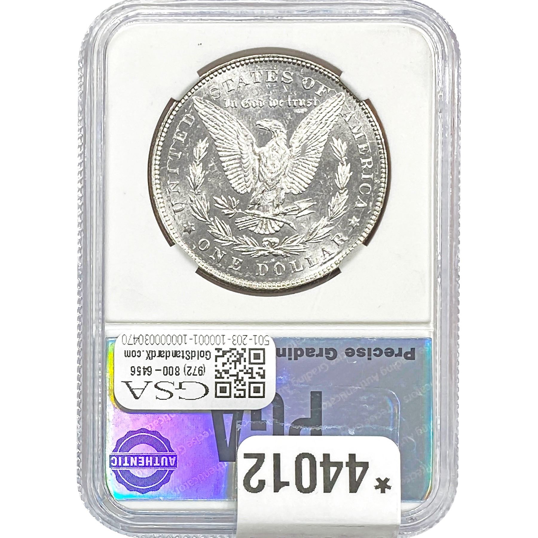 e. Coins sold referencing a third-party grading service are sold “AS IS” without any express or implied warranty, except for a guarantee by GSA that they are genuine. Removal or alteration of the holder, voids all of Bidder’s claims concerning that Product. Certain warranties may be available from the grading services and Bidders are referred to them for further details: Numismatic Guaranty Corporation (NGC), PO Box 4776, Sarasota, FL 34230, www.ngccoin.com/services/writtenguarantee.asp; Professional Coin Grading Services (PCGS), PO Box 9458, Newport Beach, CA 92658, www.pcgs.com/guarantee.html; ANACS, 6555 S. Kenton St., Ste. 303, Englewood, CO 80111; and Independent Coin Grading Co. (ICG), 7901 East Bellview, Ave., Suite 50, Englewood, CO 80111.
