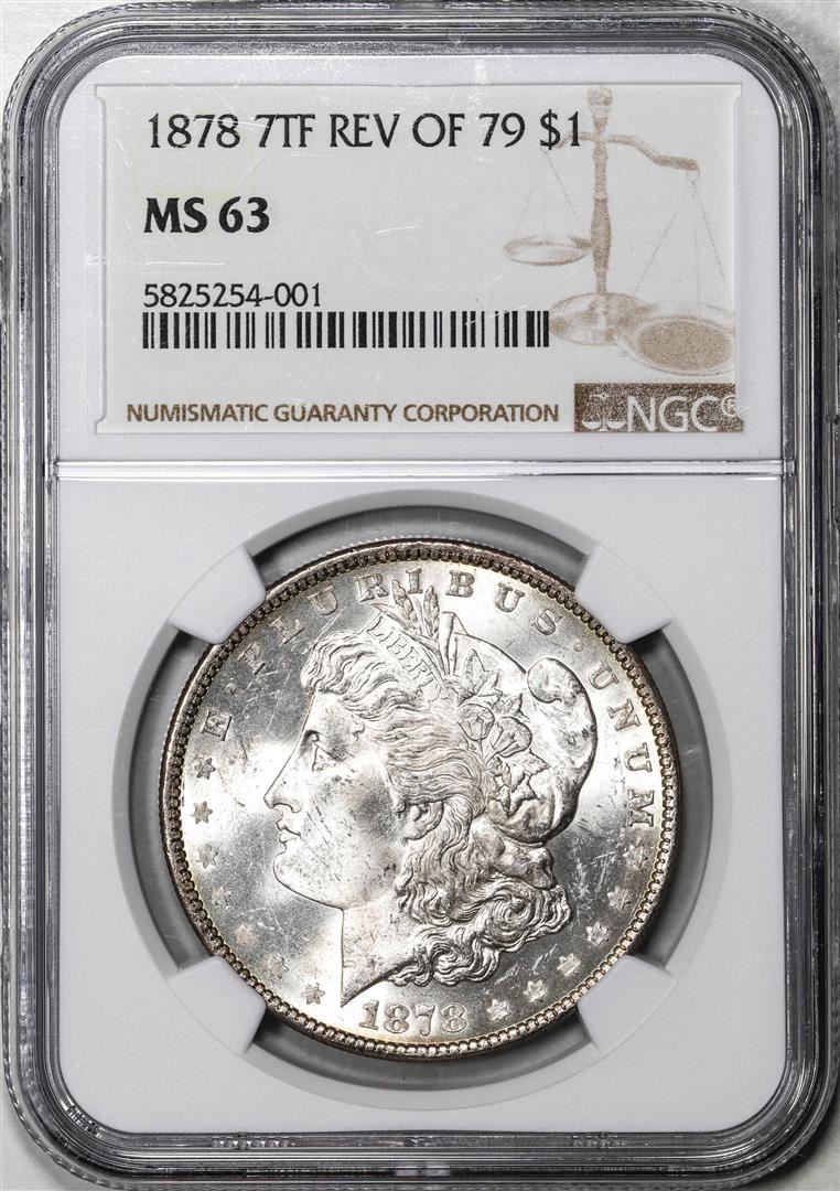 One 1878 7TF Rev of 1879 $1 Morgan Silver Dollar Coin NGC MS63. NGC Certified.