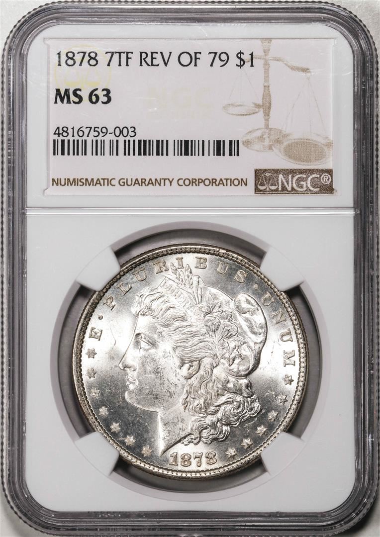 One 1878 7TF Rev of 1879 $1 Morgan Silver Dollar Coin NGC MS63. NGC Certified.