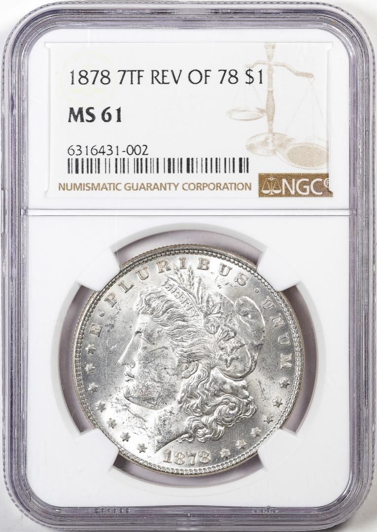 One 1878 7TF Rev of 78' $1 Morgan Silver Dollar Coin NGC MS61. NGC Certified.