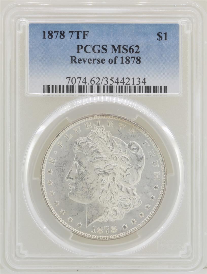 One 1878 7TF Reverse of 1878 $1 Morgan Silver Dollar Coin PCGS MS62. PCGS Certified.