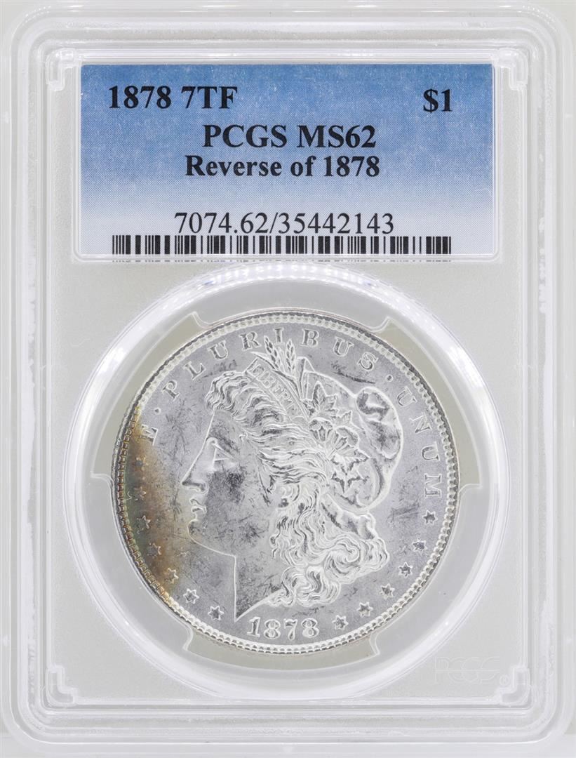 One 1878 7TF Reverse of 1878 $1 Morgan Silver Dollar Coin PCGS MS62. PCGS Graded.