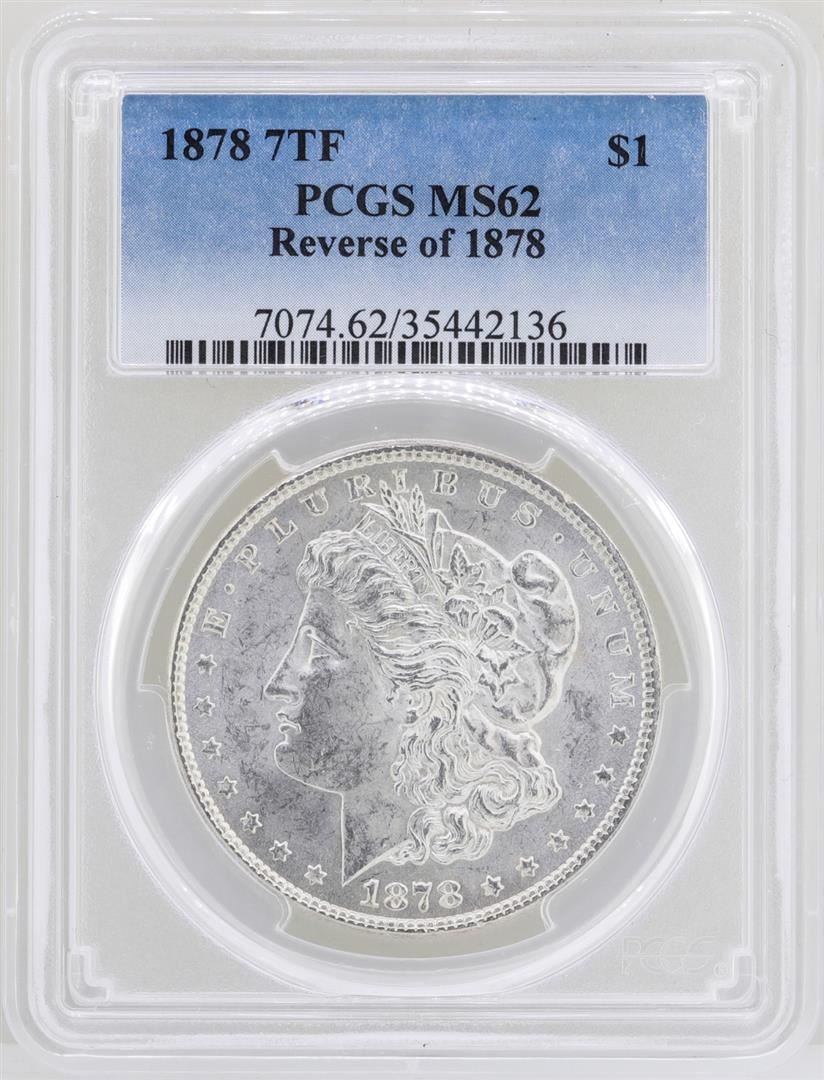 One 1878 7TF Reverse of 1878 $1 Morgan Silver Dollar Coin PCGS MS62. PCGS Graded.
